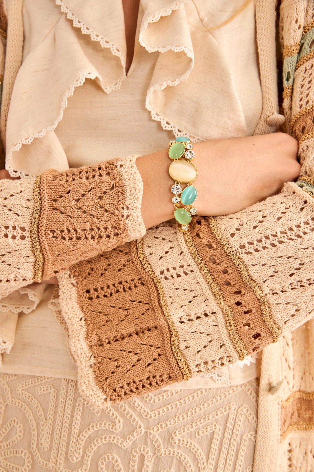 Cardigan de manga larga en tejido de punto con rayas multicolor y calados. Escote V y botonadura frontal completa. Puños y bajo acabados en forma de ondas 100% algodón TALLAS. S/M. M/L